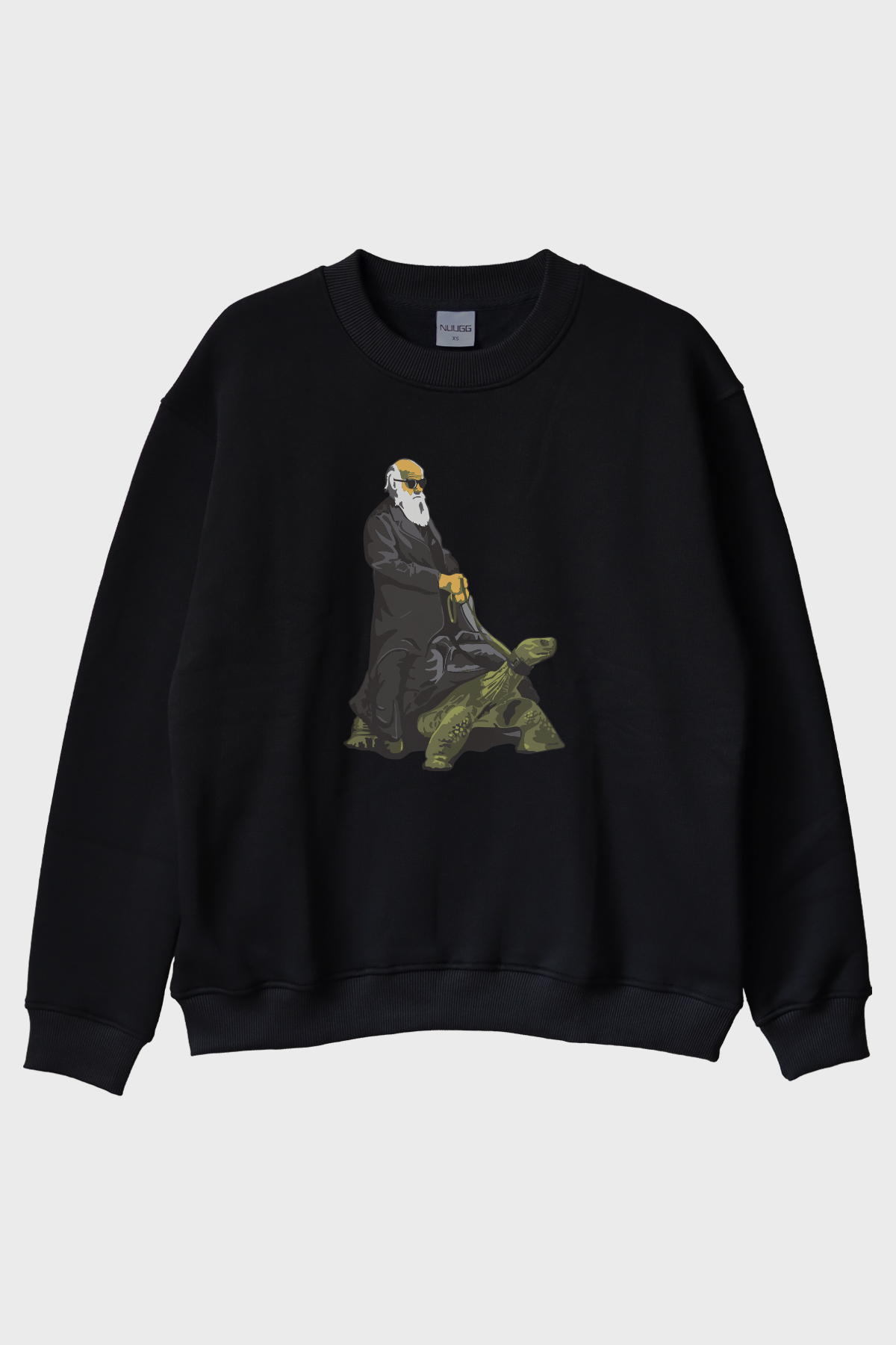 Bilim ve sanatı bir araya getiren eşsiz bir tasarım olan Kaplumbağa Darvin baskılı bisiklet yaka sweatshirt, tarihsel kişilikleri modern bir dokunuşla sunar. Tasarım, merkezde çizgisel bir sanat stili ile işlenmiş figürle dikkat çekiyor. Figür, yeşil tonlarında detaylandırılmış bir kaplumbağayı tutarken tasvir edilmiştir. Kontrast renklerin kullanıldığı siyah zemin, tasarımın dikkat çekici bilimsel ve esprili tonunu vurguluyor.