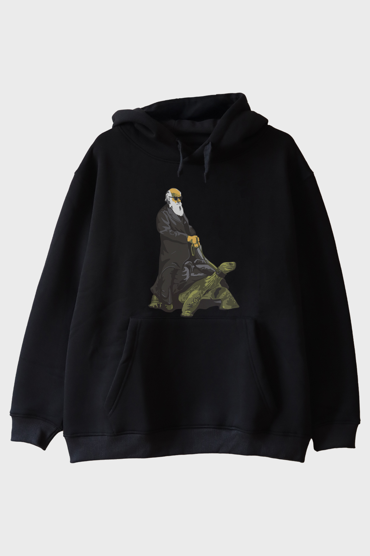 Bilim ve sanatı bir araya getiren eşsiz bir tasarım olan Kaplumbağa Darvin baskılı hoodie, tarihsel kişilikleri modern bir dokunuşla sunar. Tasarım, merkezde çizgisel bir sanat stili ile işlenmiş figürle dikkat çekiyor. Figür, yeşil tonlarında detaylandırılmış bir kaplumbağayı tutarken tasvir edilmiştir. Kontrast renklerin kullanıldığı siyah zemin, tasarımın dikkat çekici bilimsel ve esprili tonunu vurguluyor.
