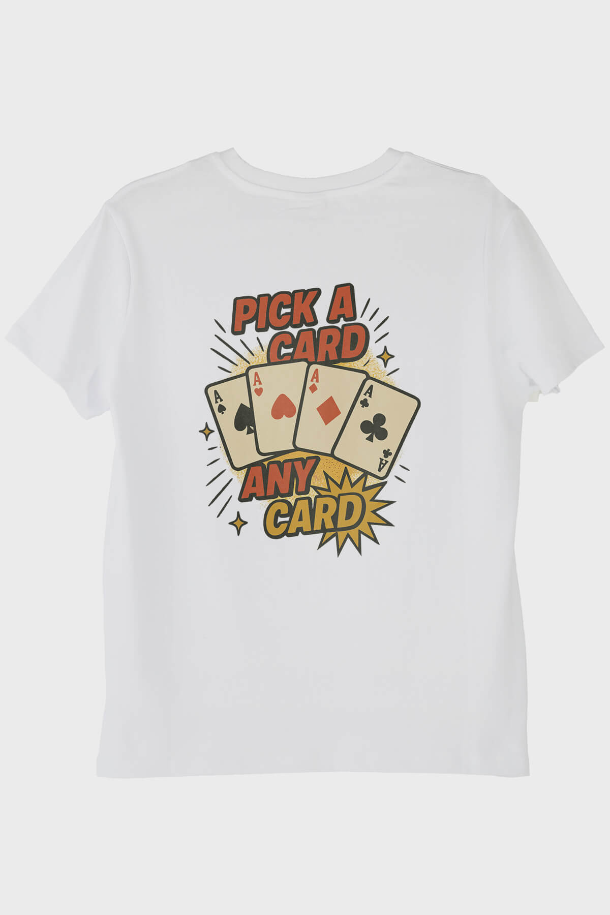 "Kart Seç Desenli Tişört", adından da anlaşılacağı üzere üzerindeki baskıyla dikkat çeken bir parça. Sağ göğsünde yer alan kart destesi ve "Pick a Card Any Card" yazısıyla, oyun toplayıcılarının ve eğlence tutkunu kişilerin ilgisini çekecek bu tasarım, giyeni sıradan bir günün içine dahil edebilecek güçte. Eğlence, mizah ve bolca oyun temasıyla tasarlanan bu ürün, adeta bir sempati mesajı veriyor. Tasarımın bu canlı ve neşeli yapısı, Irony kategorisinde benzerleri bulunan esprili kıyafetlerle büyük bir uyum sergiliyor.