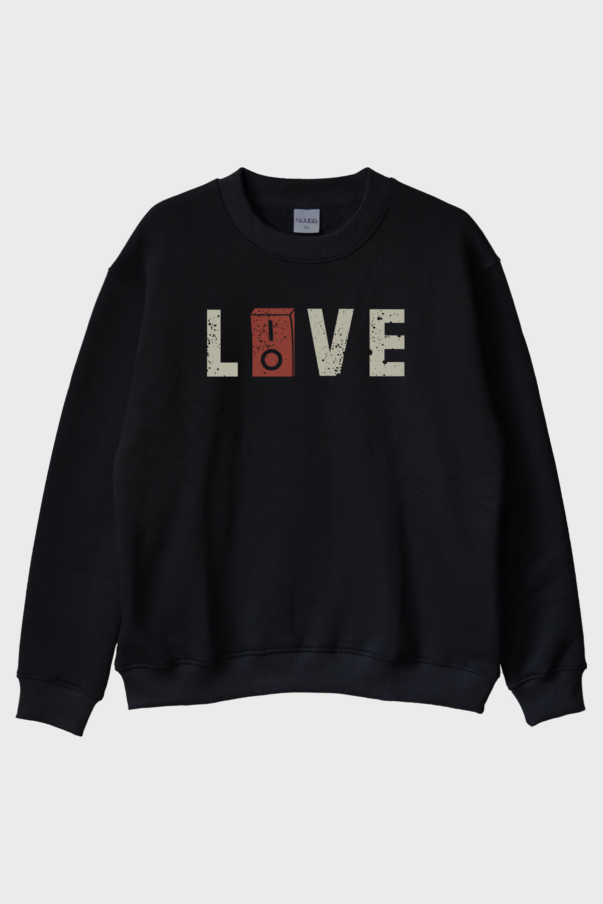 Bu modern ve yaratıcı LOVE baskılı bisiklet yaka sweatshirt, ön yüzündeki büyük puntolar ve yaratıcı tasarımı ile dikkat çekiyor. Bisiklet Yaka Sweatshirtün üzerinde 'LOVE' kelimesi yer alırken, 'O' harfinin yerine kırmızı renkte bir elektrik düğmesi figürü kullanılmış. Bildiğimiz yazı tiplerinin aksine, dokulu bir tarz ile sunulan beyaz yazılar siyah zemin üzerinde çarpıcı bir kontrast oluşturuyor.
