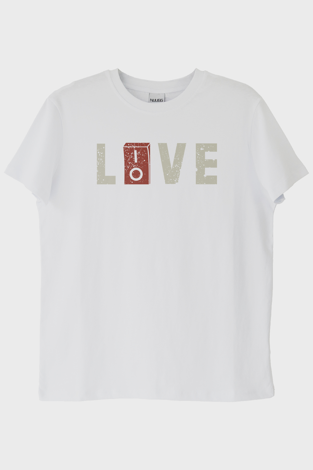 Bu modern ve yaratıcı LOVE baskılı tişört, ön yüzündeki büyük puntolar ve yaratıcı tasarımı ile dikkat çekiyor. Tişörtün üzerinde 'LOVE' kelimesi yer alırken, 'O' harfinin yerine kırmızı renkte bir elektrik düğmesi figürü kullanılmış. Bildiğimiz yazı tiplerinin aksine, dokulu bir tarz ile sunulan beyaz yazılar siyah zemin üzerinde çarpıcı bir kontrast oluşturuyor.