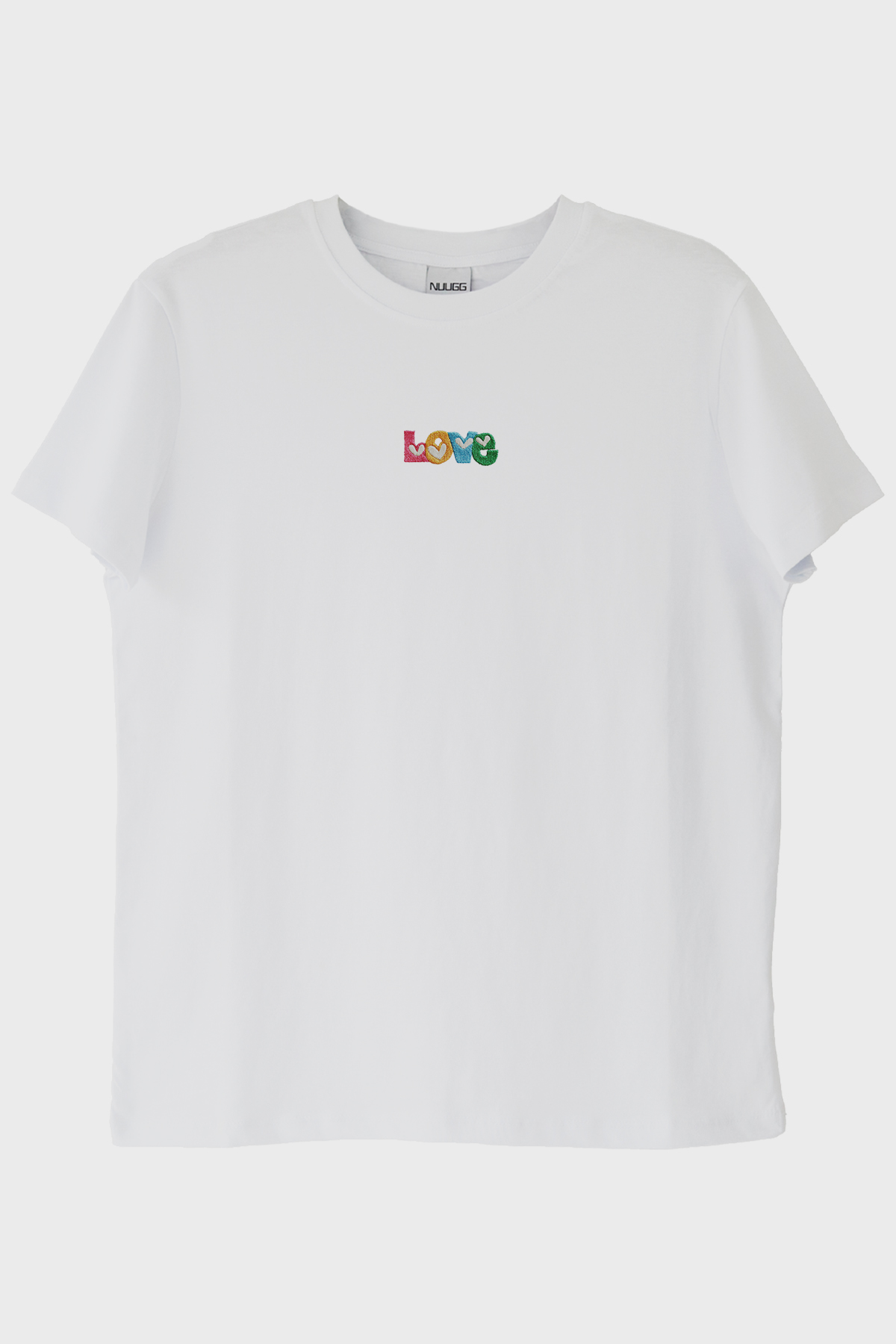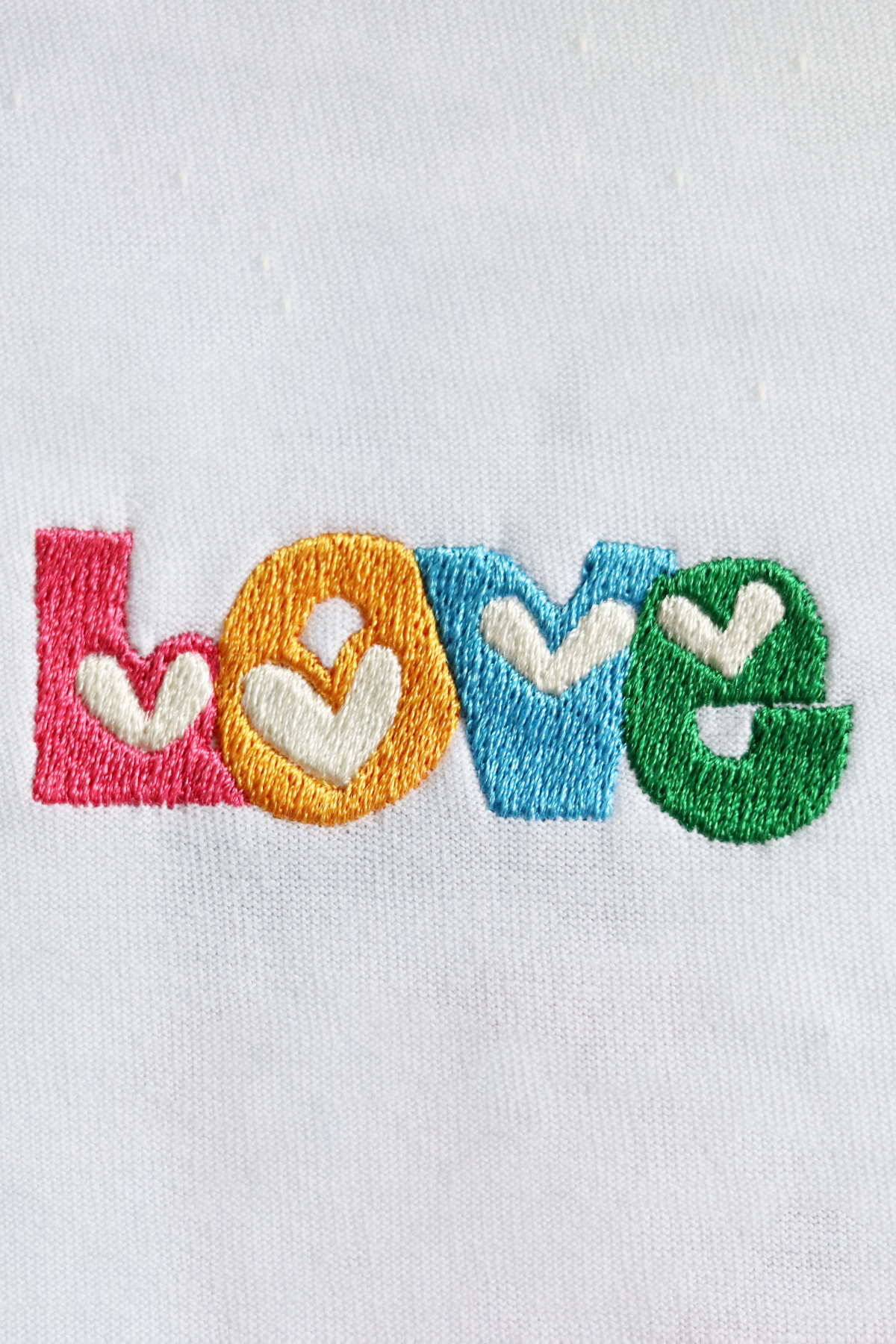 Bu özel tasarımlı tişört, ön yüzünde renkli LOVE yazısı ve harflerin içinde yer alan beyaz kalp detayları ile Sevgililer Günü için harika bir seçimdir. Harflerin sırasıyla pembe, sarı, mavi ve yeşil renklerde işlenmesi, tişörte enerjik ve canlı bir görünüm kazandırır. Her bir harfin içine yerleştirilen beyaz kalp figürleri ise, sevgi dolu bir mesaj iletir.