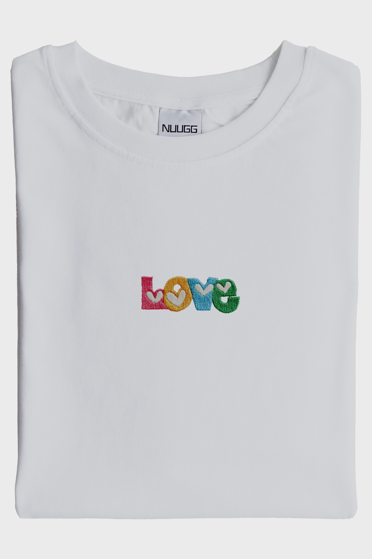 Sevgi ve mutluluğu simgeleyen bu tişört, sadece Sevgililer Günü'nde değil, her gün rahatça giyilebilecek modern bir tasarıma sahiptir. Beyaz kalpler ve renkli harflerle tasarlanmış bu tişört, sevginizi ifade etmenin zarif ve şık bir yoludur.