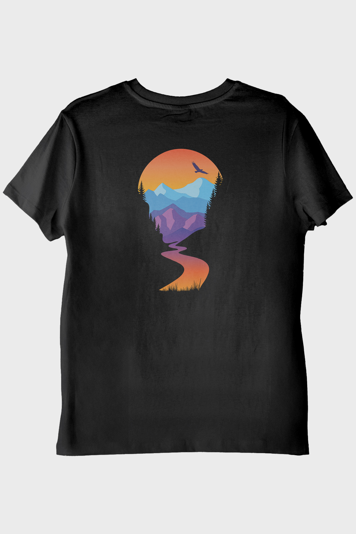 Montain Baskılı Doğal Manzara Tasarım Siyah Tişört