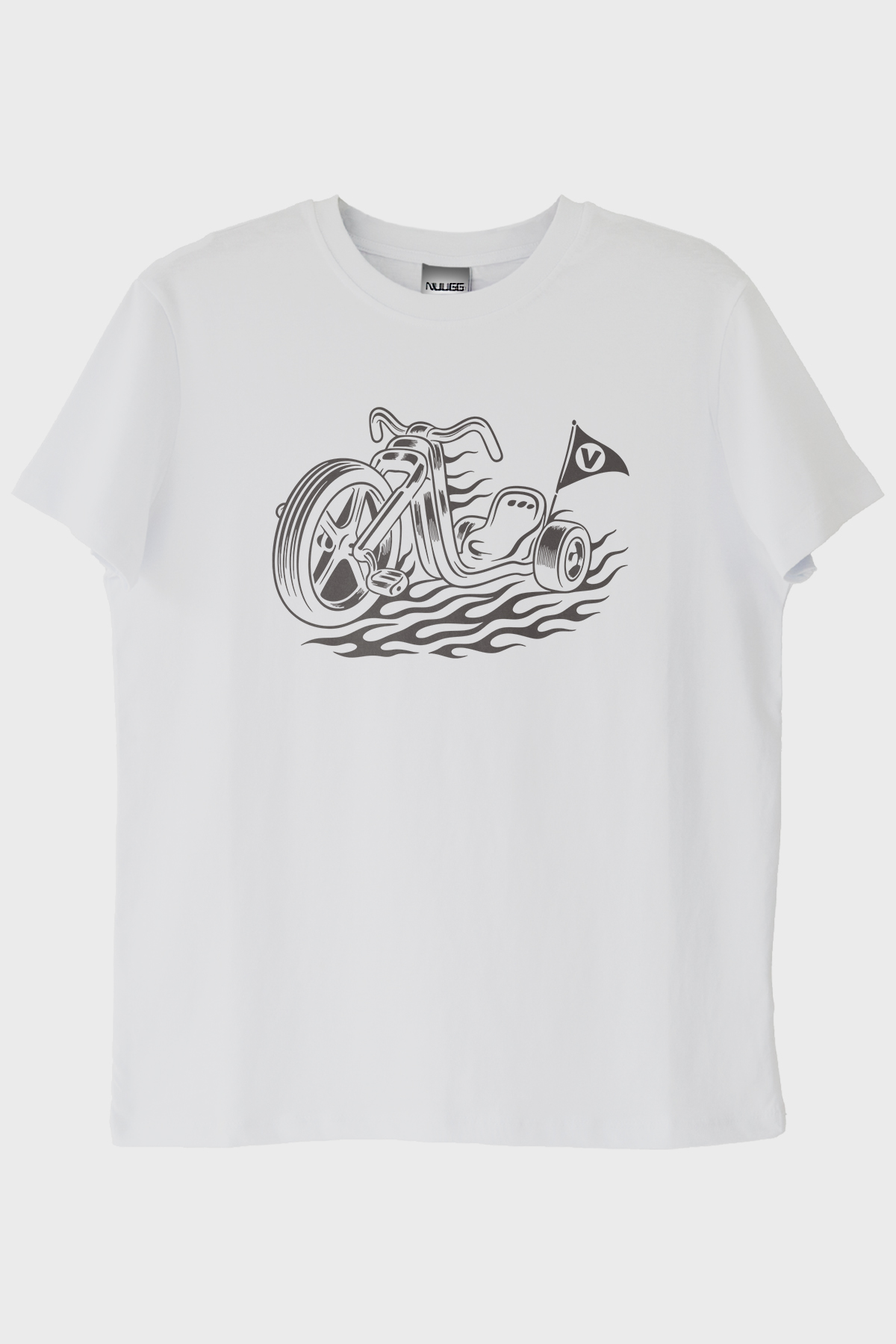 Motorlu Bayrak Tasarımlı Biker Beyaz Tişört