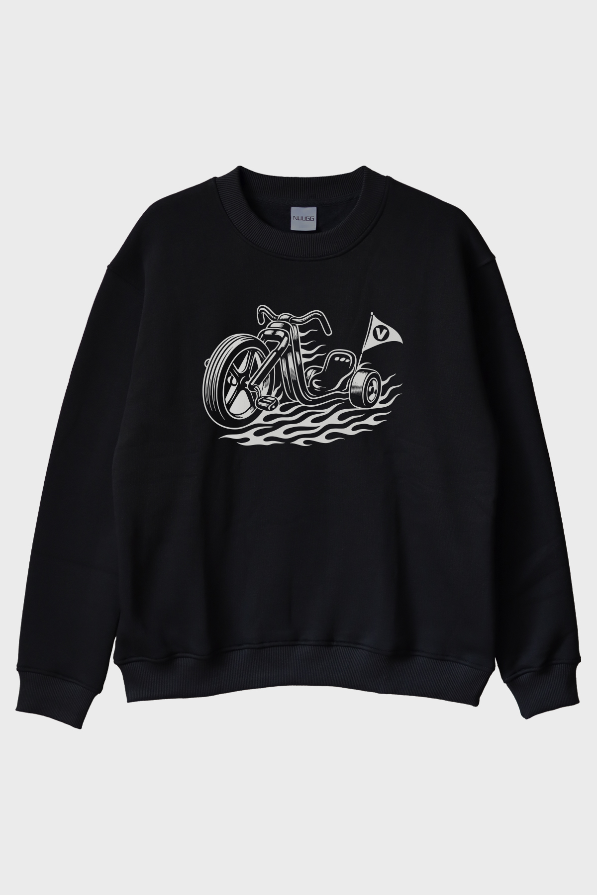 Motorlu Bayrak Tasarımlı Biker Siyah Bisiklet Yaka Sweatshirt