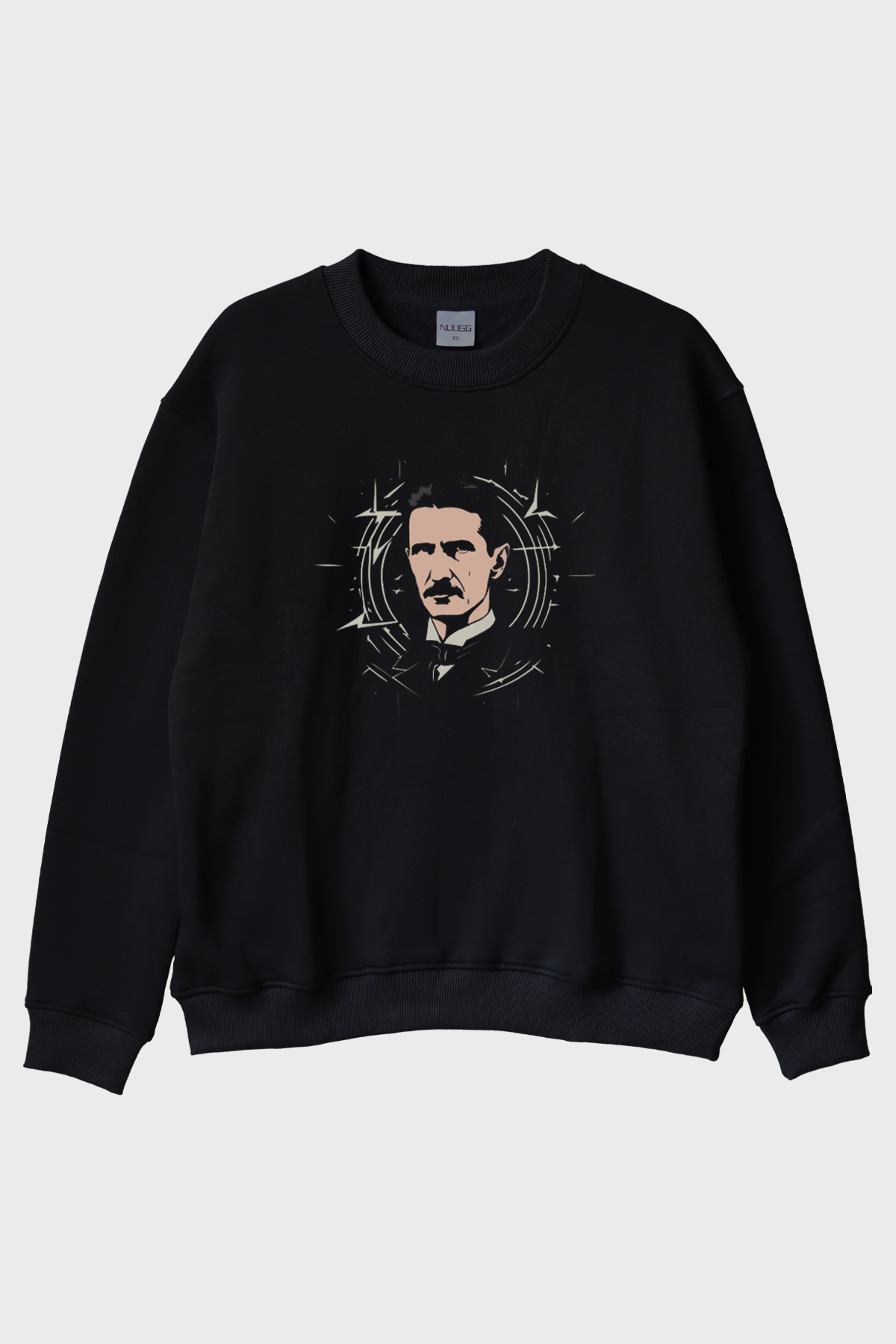 Nikola Tesla İllüstrasyon Baskılı Tasarım Bisiklet Yaka Sweatshirt