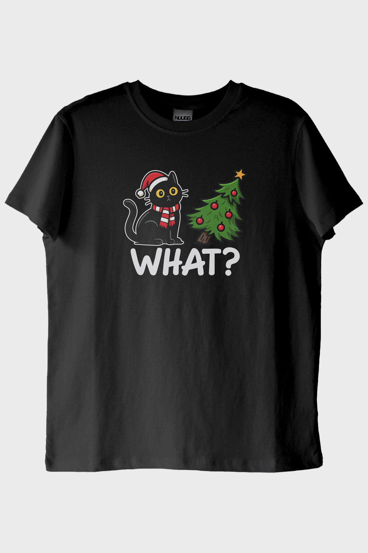 Noel Kedisi tasarımı, sevimli bir siyah kedinin başına taktığı Noel şapkası ve yanında duran süslenmiş Noel ağacı ile dikkat çekiyor. Altında yazan "WHAT?" ifadesi ise bu eğlenceli görüntüye mizahi bir dokunuş katıyor. Bu tasarımın enerjisi, kediseverler ve yılbaşının coşkusunu giyimlerinde taşımak isteyenler için mükemmel bir seçenek oluşturuyor. Yılbaşı temalı bu ürün, hem stilinize neşe katacak hem de sevdikleriniz için harika bir hediye seçeneği sunacaktır.