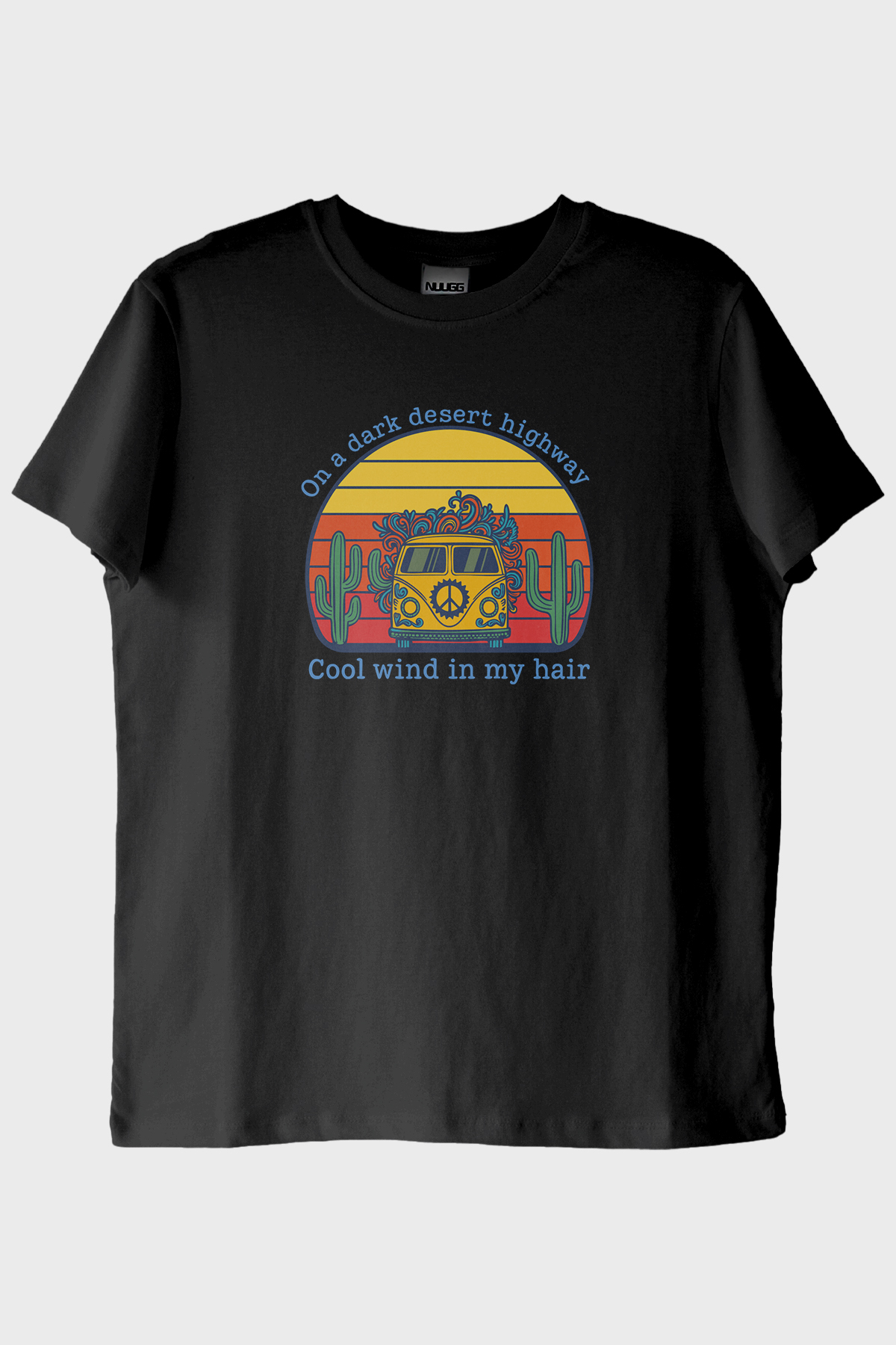 Özgürlüğün ve yolculuğun ruhunu hissettiren On a Dark Desert Highway Retro Baskılı Tişört, benzersiz tasarımıyla dikkat çekiyor. Bu tişört, ön yüzünde sarı ve turuncu tonlarında güneş batımı efekti ve çöl teması ile öne çıkıyor. Retro havasını vurgulayan tasarımda, kaktüslerle çevrili, barış işaretiyle süslenmiş bir minibüs yer almakta. Üst kısmında "On a dark desert highway," ve altında "Cool wind in my hair" yazıları bulunuyor.