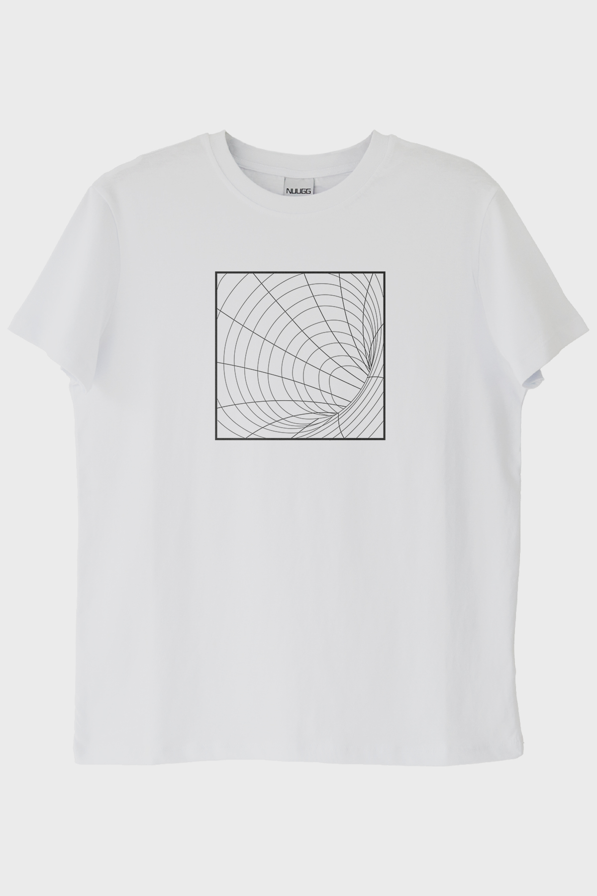 Bu modern ve minimalist tişört, merkezinde yer alan siyah-beyaz optik illüzyon deseniyle dikkat çekiyor. Tişörtün ana rengi beyaz olup, bu sade arka plan optik illüzyon desenini ön plana çıkarıyor. Kare şeklindeki tasarım, ince siyah hatlarla oluşturulmuş spirallerden meydana geliyor ve derinlik hissi veriyor. Bu geometrik ve matematiksel sanatsal tasarım Bilim ve Teknoloji ve Artisan tasarımlarından ilham alır.