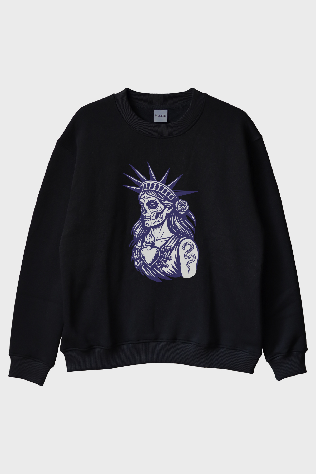 Bu baş döndürücü yapılara sahip baskılı bisiklet yaka sweatshirt, ön yüzünde özgün bir illüstrasyon taşıyor. Beyaz zemin üzerine koyu mavi tonlarında tasarlanan Özgürlük Heykeli stilinde bir karakter içeren bu bisiklet yaka sweatshirt, etkileyici detaylarla dikkat çekiyor. Karakterin yüzünün iskelet yapısına benzer zarif çizgilerle betimlenmesi sanatseverlerin ilgisini çekecek türden. Ayrıca, başından aşağıya doğru Özgürlük Heykeli’nin taç benzeri başlığı ve kulağındaki çiçek, sanatsal tasarıma farklı bir boyut katıyor.