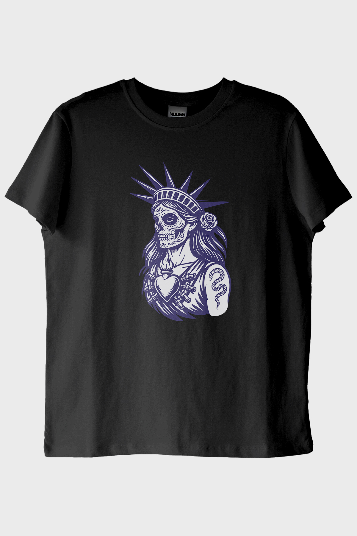 Bu baş döndürücü yapılara sahip baskılı tişört, ön yüzünde özgün bir illüstrasyon taşıyor. Beyaz zemin üzerine koyu mavi tonlarında tasarlanan Özgürlük Heykeli stilinde bir karakter içeren bu tişört, etkileyici detaylarla dikkat çekiyor. Karakterin yüzünün iskelet yapısına benzer zarif çizgilerle betimlenmesi sanatseverlerin ilgisini çekecek türden. Ayrıca, başından aşağıya doğru Özgürlük Heykeli’nin taç benzeri başlığı ve kulağındaki çiçek, sanatsal tasarıma farklı bir boyut katıyor.