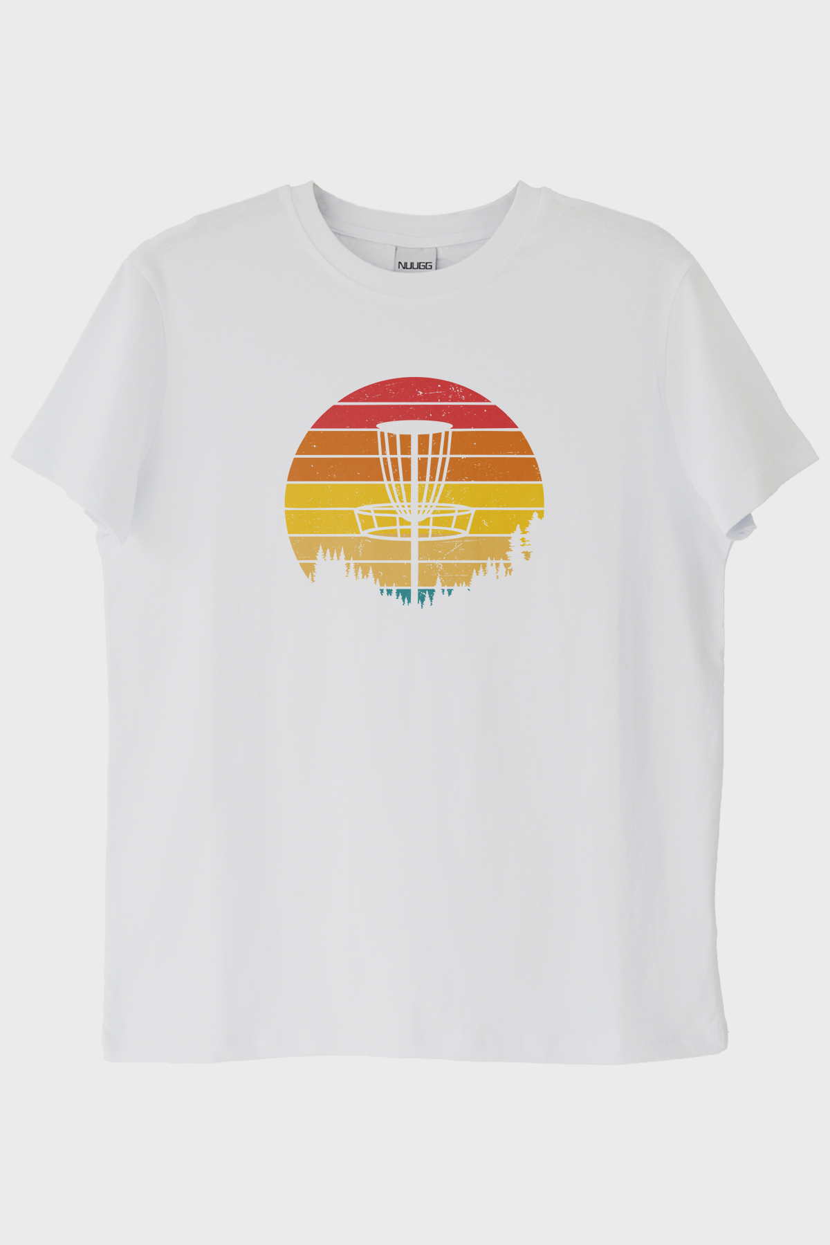 Bu eşsiz baskılı tişört, tarzınıza nostaljik bir hava katıyor. Ön yüzünde, güneş batışını andıran bir renk paleti ile yuvarlak bir desen öne çıkıyor. Tasarımın merkezinde yer alan beyaz renkli disk golf sepeti silueti, retro tasarımın öne çıkan unsurlarından biri. Sepetin alt kısmında ağaçlarla çerçevelenen bu desen, hem doğaseverlerin hem de spor meraklılarının ilgisini çekebilir. Kırmızı, turuncu, sarı ve turkuaz tonlarıyla tasarlanan bu tişört, yaz günlerinde rahatlıkla tercih edilebilir.