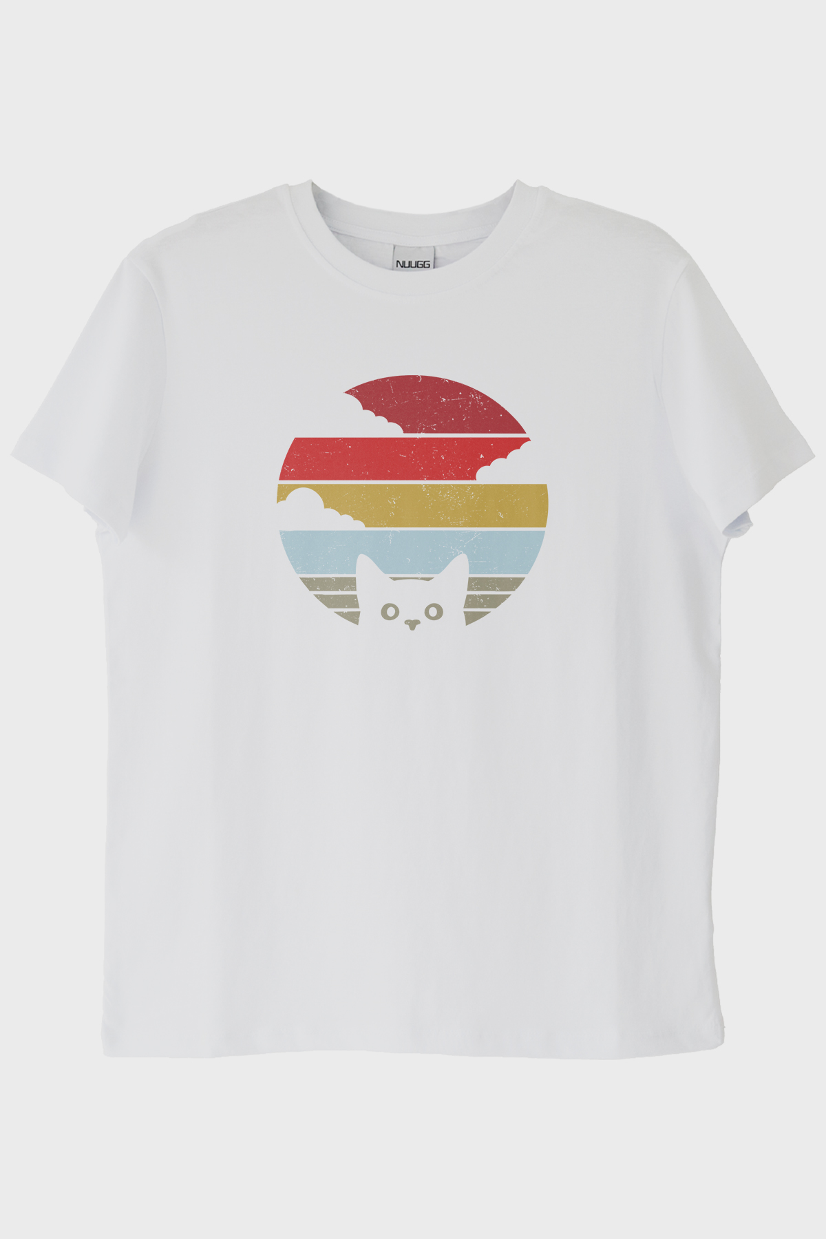 Bu özel bir tişört ile stilinize renk katın! Retro kedi baskılı tişört, benzersiz tasarımıyla moda tutkunlarının vazgeçilmezi olacak. Beyaz zemin üzerinde öne çıkan dairesel grafik, tasarımın merkezinde yer alan sevimli kedi figürü ile birleşiyor. Kırmızı, sarı ve mavi tonlarında yatay şeritlerle çevrili kedi figürü, retro bir hava yaratırken modern bir dokunuş sunuyor.
