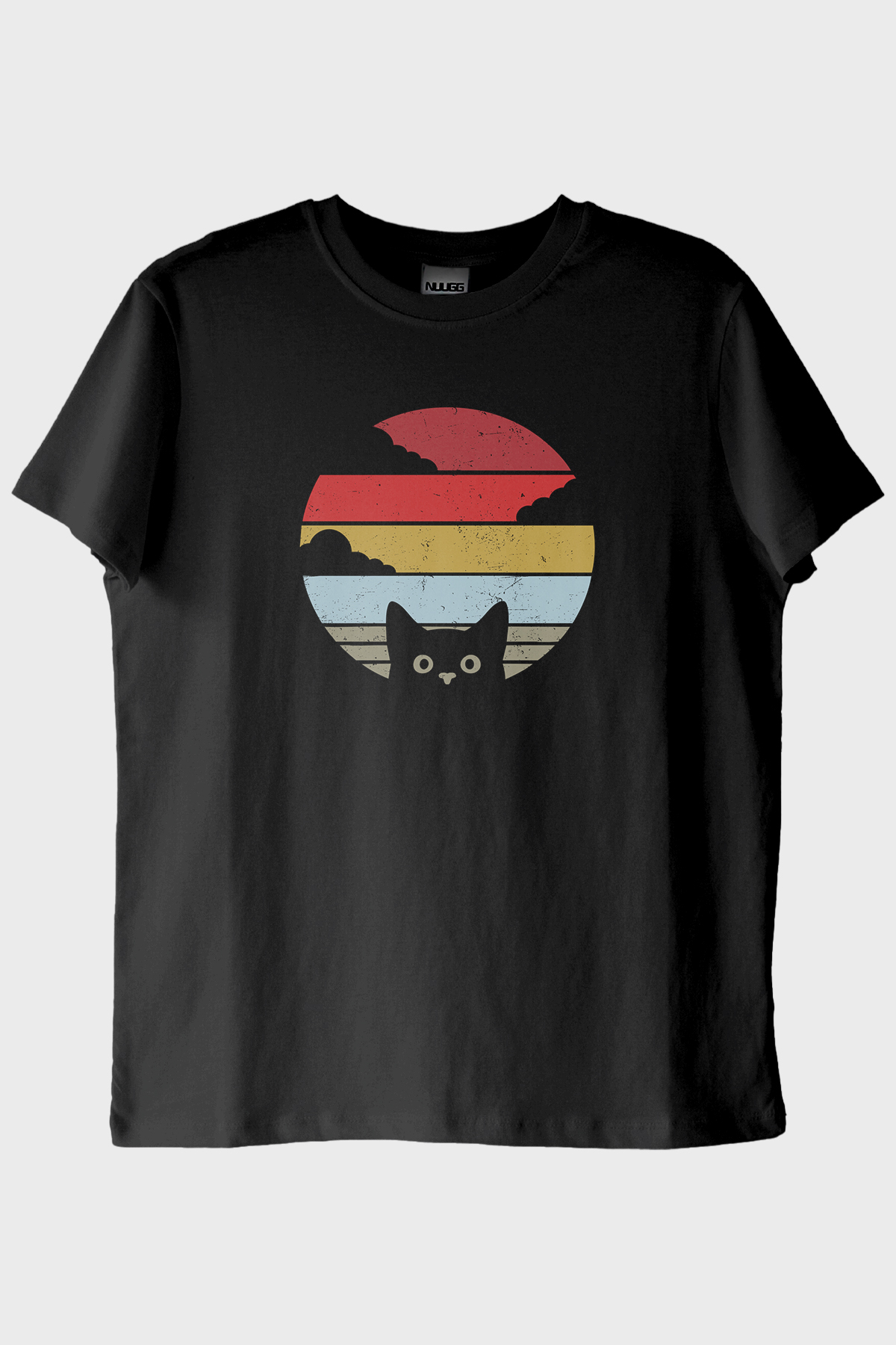 Bu özel bir tişört ile stilinize renk katın! Retro kedi baskılı tişört, benzersiz tasarımıyla moda tutkunlarının vazgeçilmezi olacak. Beyaz zemin üzerinde öne çıkan dairesel grafik, tasarımın merkezinde yer alan sevimli kedi figürü ile birleşiyor. Kırmızı, sarı ve mavi tonlarında yatay şeritlerle çevrili kedi figürü, retro bir hava yaratırken modern bir dokunuş sunuyor.
