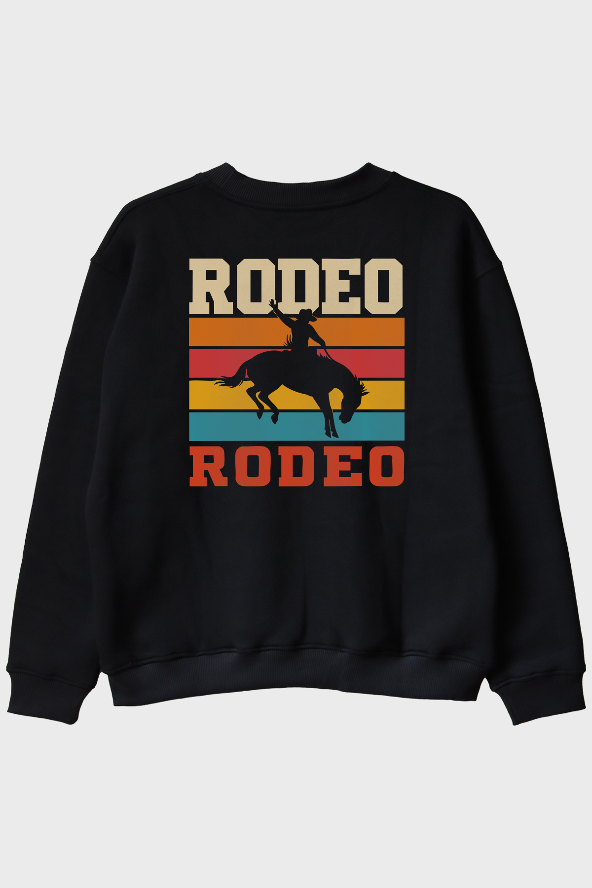 Rodeo temalı bu eşsiz beyaz bisiklet yaka sweatshirt, tarzınıza nostaljik bir dokunuş katıyor. Arka yüzünde büyük bir rodeo sahnesi yer alırken, tasarımı retro tarzında çizilmiş bir kovboy ve at silueti domine ediyor. Bu detaylar, üzerlerindeki yatay turuncu, kırmızı ve mavi renkli şeritlerle birleşerek dikkat çekici bir görünüme sahip. Üst kısmında yer alan bej renkteki ve alt kısmındaki kırmızı renkli 'RODEO' yazısı, tasarımı tamamlayan estetik unsurlar arasında bulunuyor.