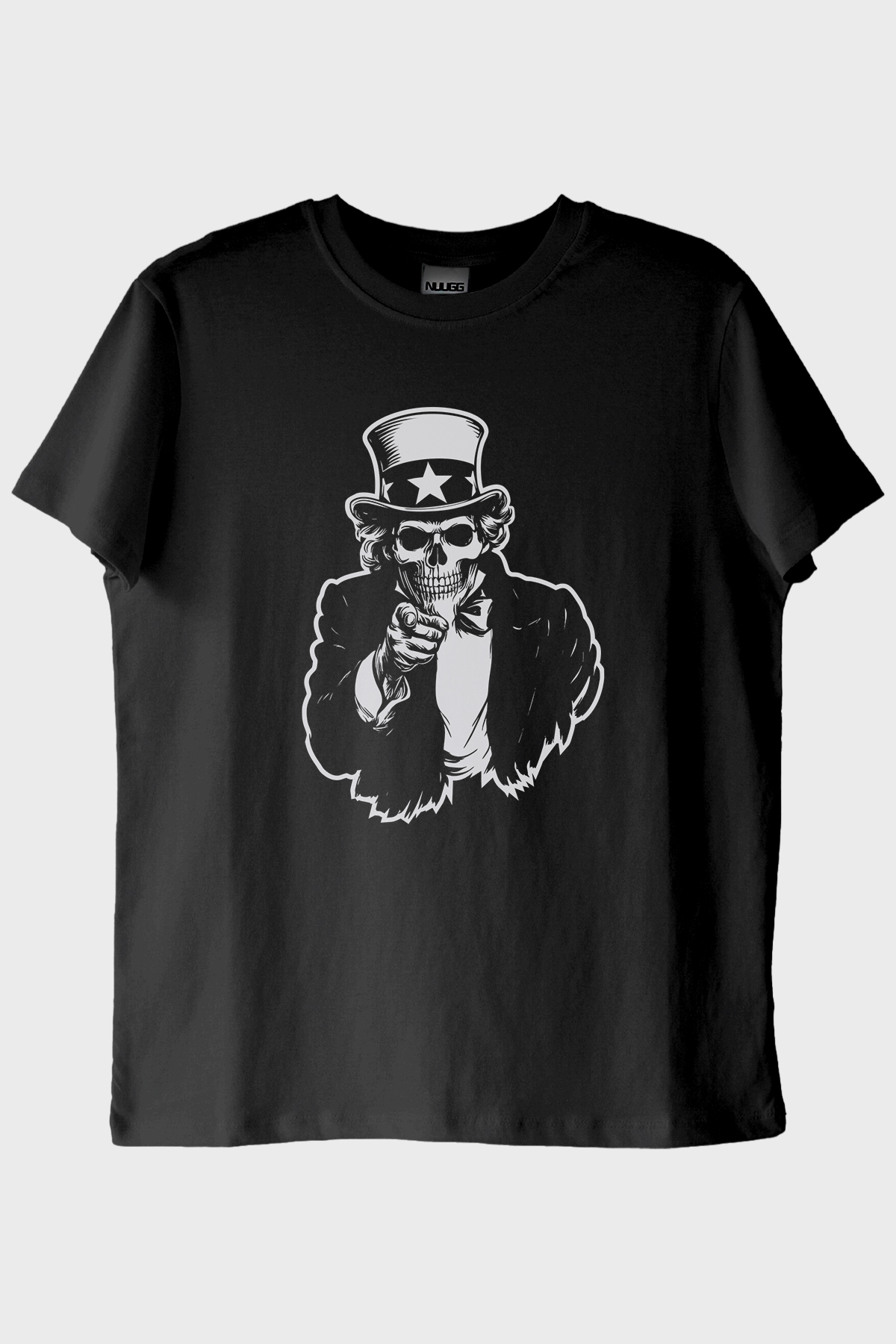 Tarzınızı, mizahi ve karanlık bir dokunuşla yansıtan bu şapkalı iskelet baskılı tişört ile ifade edebilirsiniz. %100 pamuklu malzemeden üretilen bu tişört, cilt dostu yapısıyla gün boyu konfor sunar. Üzerindeki tasarım, merkezi bir konumda, siyah-beyaz tonlarıyla dikkat çekiyor. Yıldız desenli şapkası ve doğrudan izleyiciye işaret edişi, mizahi ve dikkat çekici bir ifade katıyor.