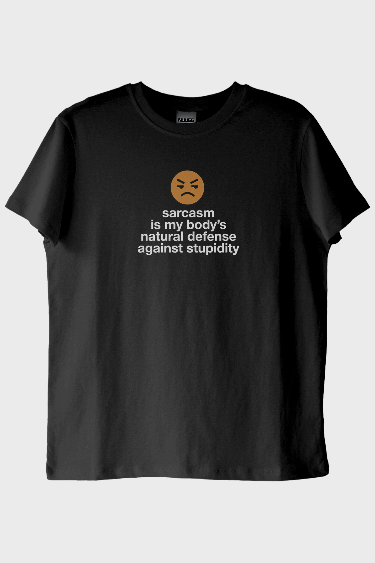 Mizah duygusu güçlü olanların gardırobuna eklemek isteyeceği bir parça olan SarcasmDefense baskılı tişört, esprili tasarımıyla dikkat çekiyor. Ön yüzünde yer alan somurtkan ifadeli emoji, altında ise beyaz yazıyla "sarcasm is my body’s natural defense against stupidity" sloganı yer alıyor. Bu sade ve etkili tasarım, minimalist bir yaklaşımla sunulmuş olup, %100 pamuktan üretilmiştir. Yerli üretim olan bu tişört, yüksek kalite baskısı sayesinde uzun ömürlü kullanım imkanı sunar.
