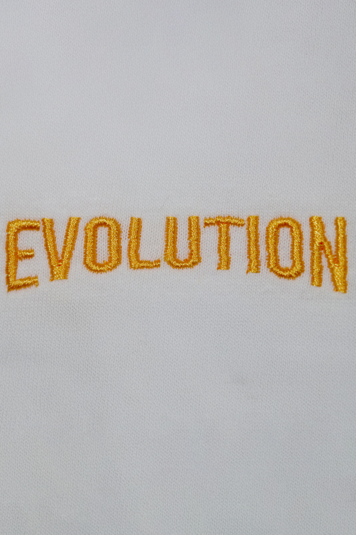 Göğüs bölgesine işlenmiş sarı "Evolution" yazısı, canlı renkleri ve yüksek kalite nakış tekniğiyle uzun süre dayanıklılığını koruyacak şekilde tasarlandı. Nakış detayları, bilim ve sanatı bir araya getirerek modern bir görünüm sunar.