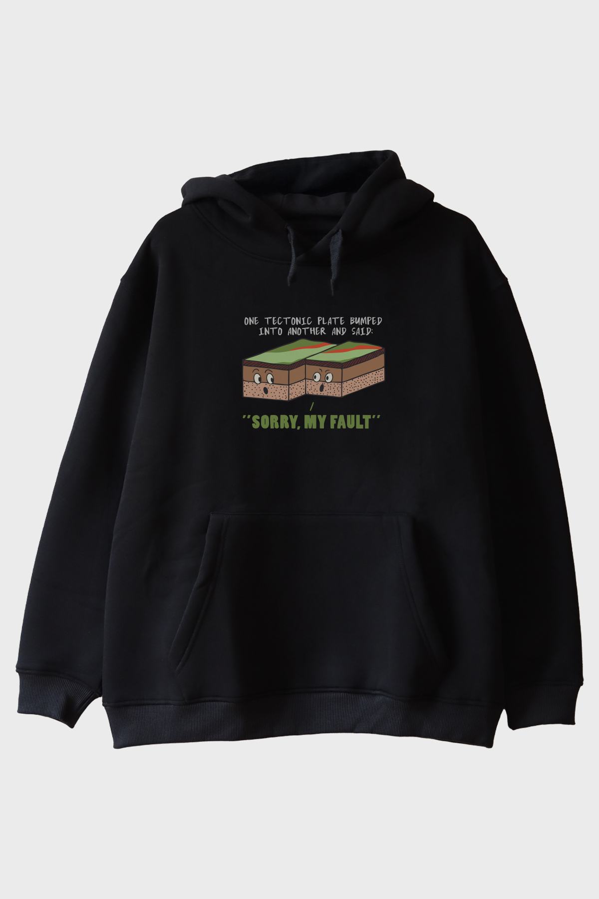 hoodie, hem eğlenceli hem de düşündürücü bir seçenek arayanlar için tasarlandı. Hoodieün ön yüzünde yer alan tasarım, iki tektonik plakanın yüz ifadeleriyle bir araya gelerek, "One tectonic plate bumped into another and said:" üst yazısıyla birleşir ve alt kısımda "Sorry, my fault" esprisini sunar. Bu, bilim severler ve mizahi zekalarıyla tanınanlar için mükemmel bir giysi seçeneği.