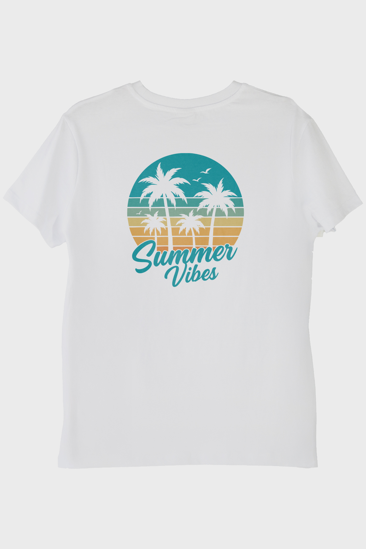 Summer Vibes Baskılı Tropik Plaj Tasarımlı Beyaz Tişört