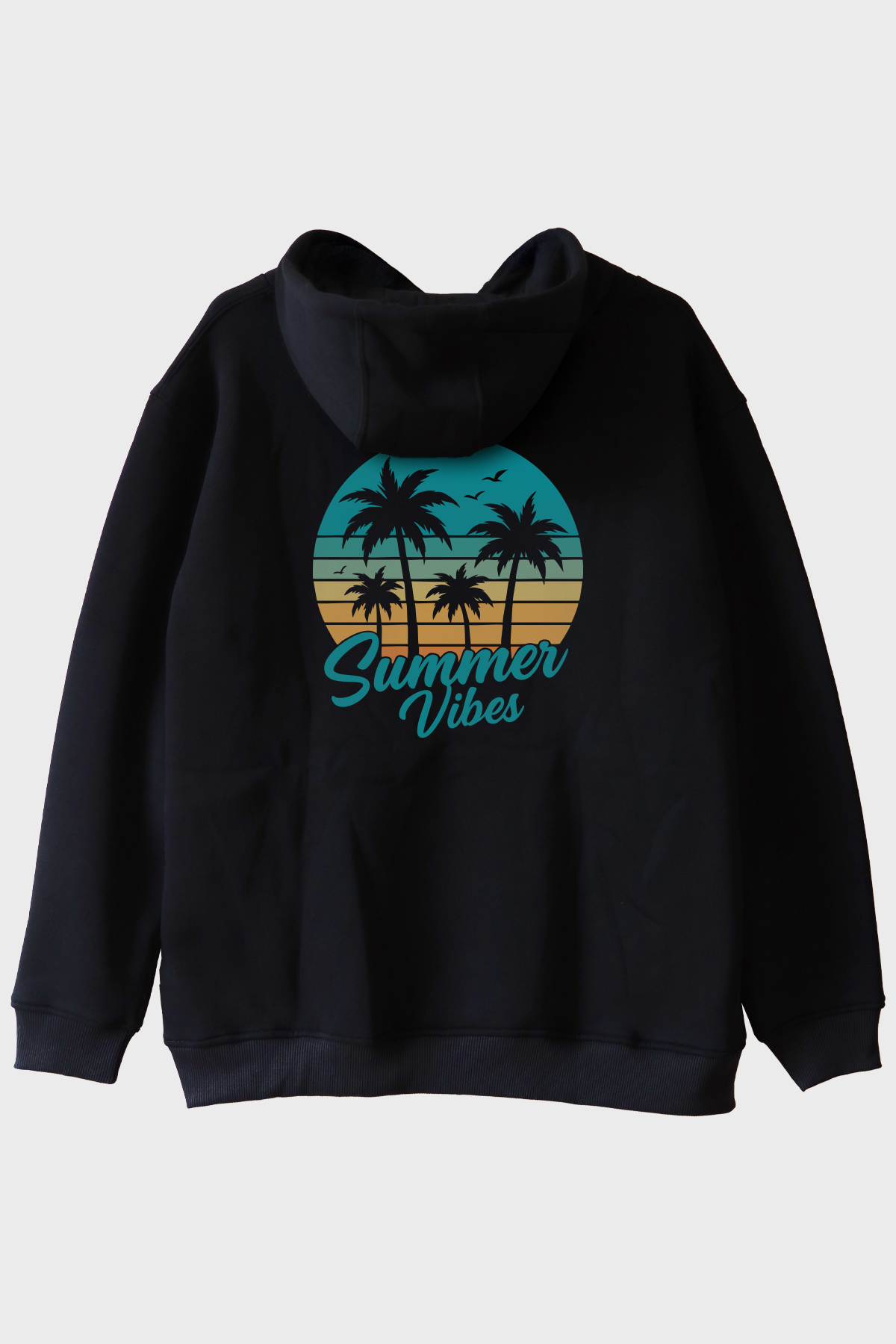 Summer Vibes Baskılı Tropik Plaj Tasarımlı Siyah Hoodie