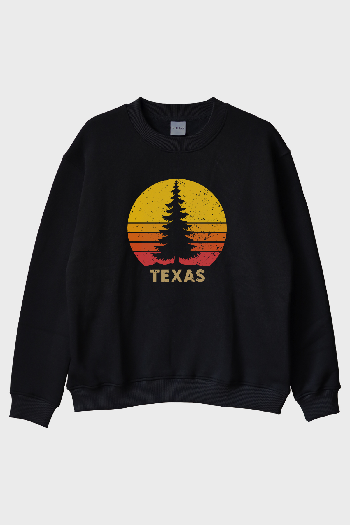 Doğa temalarını ve minimalizmi bir araya getiren bu özel tasarımlı bisiklet yaka sweatshirt, T Shirt koleksiyonunun özgün bir parçasıdır. Üzerindeki büyük yuvarlak grafik, sarı ve kırmızının sıcak tonlarındaki arka planıyla, gün batımını ve doğayı harmanlıyor. Grafiğin merkezinde yer alan sivri ağaç silüeti, doğa severlerin kalbini ısıtacak bir detay sunuyor. Ayrıca hemen altında yer alan "TEXAS" kelimesi, bu tasarıma unik bir dokunuş katıyor.