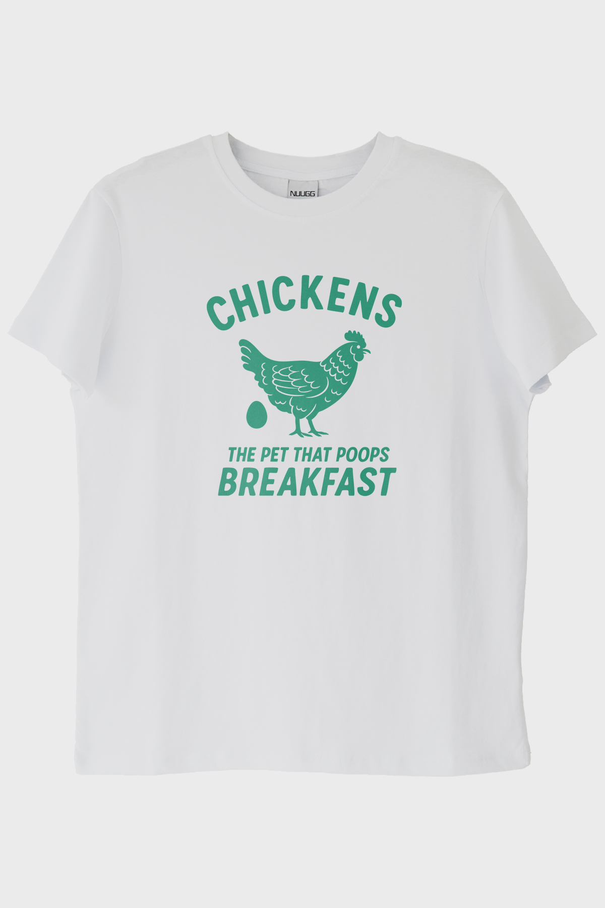 Bu eşsiz CHICKENS tasarımı baskılı tişört, hem mizahi hem de doğa temasını bir arada sunuyor. Beyaz bir zemin üzerine yapılmış yeşil baskının üzerinde büyük harflerle “CHICKENS” yazısı dikkat çekerken, altında yer alan tavuk ve yumurta görseli tasarıma hareketlilik katıyor. Tavuğun altında bulunan “THE PET THAT POOPS BREAKFAST” yazısı ise mizahi bir dokunuş sağlıyor.