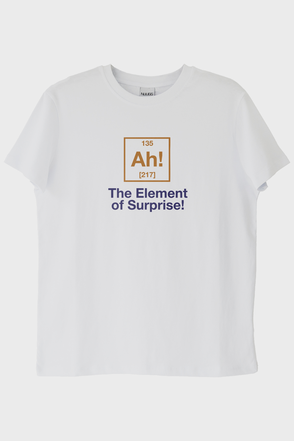 Bilim ve mizahın ortak noktasında yer alan bu eşsiz tişört tasarımı ile tarzınıza yeni bir soluk kazandırın! Merkezi konumda bulunan periyodik tablo stilindeki "Ah!" elementi ve altındaki "The Element of Surprise!" ifadesi ile hem bilim tutkunlarının hem de espri anlayışı olanların dikkatini çekecek bir ürün. Ürün %100 pamuktan üretilmiş olup, cilt dostu ve uzun ömürlü yapısıyla dikkat çekiyor. Tasarımındaki kahverengi ve koyu mavi tonları ile uyumlu bir görünüm sunuyor.