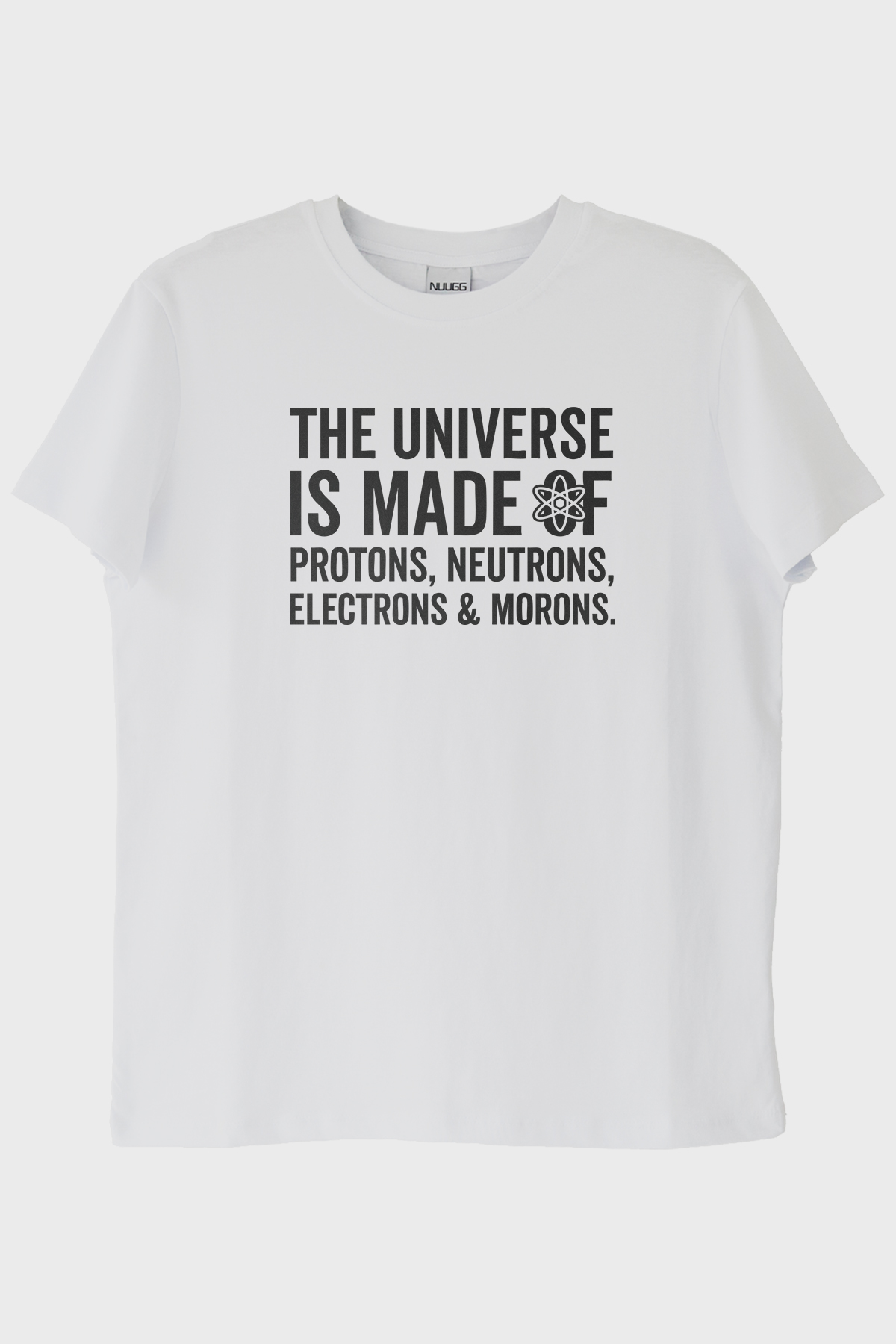 Bilime ve mizaha merak duyanlar için özel olarak tasarlanan bu tişört, %100 pamuk yapısıyla cildinize dost ve son derece rahat bir kullanım sunar. Üzerinde büyük puntolarla 'THE UNIVERSE IS MADE OF PROTONS, NEUTRONS, ELECTRONS & MORONS.' ifadesi yer alır. Bu mizahi cümle, evrenin yapısıyla esprili bir gönderme yaparken; hemen yanında yer alan atom sembolü ile de bilim temasını güçlendirir. Sans-serif yazı stili ile modern bir görünüm kazanan bu baskılı tişört, bilim ve teknoloji meraklılarına hitap ederek, onlara kendilerini ifade etme imkanı sunuyor. T Shirt koleksiyonumuzda yer alırken, Bilim ve Teknoloji ve Irony gibi temalarla da uyumlu hale getirildi.