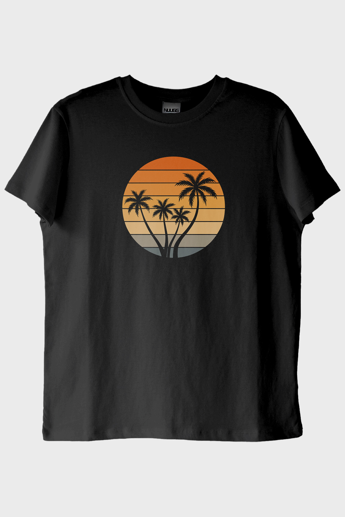 Tropik Gün Batımı Palmiye Baskılı Siyah Tişört