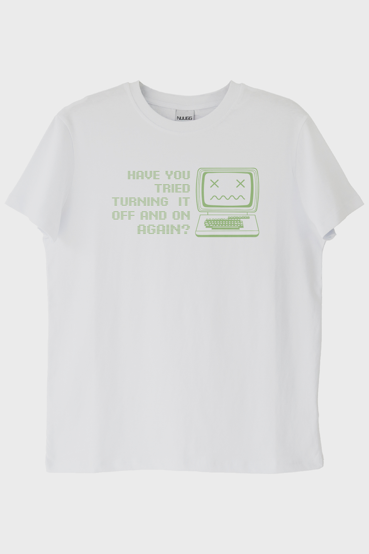 Bu eşsiz tasarımlı tişört, teknoloji ve mizah dünyasını bir araya getiriyor. Ön kısmında yer alan yeşil renkteki minimalist retro bilgisayar grafiği ve hemen yanında yer alan 'HAVE YOU TRIED TURNING IT OFF AND ON AGAIN?' yazısı, günümüz teknoloji dünyasının klasik esprilerinden birini sunuyor. Piksel stilindeki bu grafik ve yazı, nostaljik bir bilgisayar ekranı efekti vererek kullanıcıya benzersiz bir deneyim yaşatıyor.