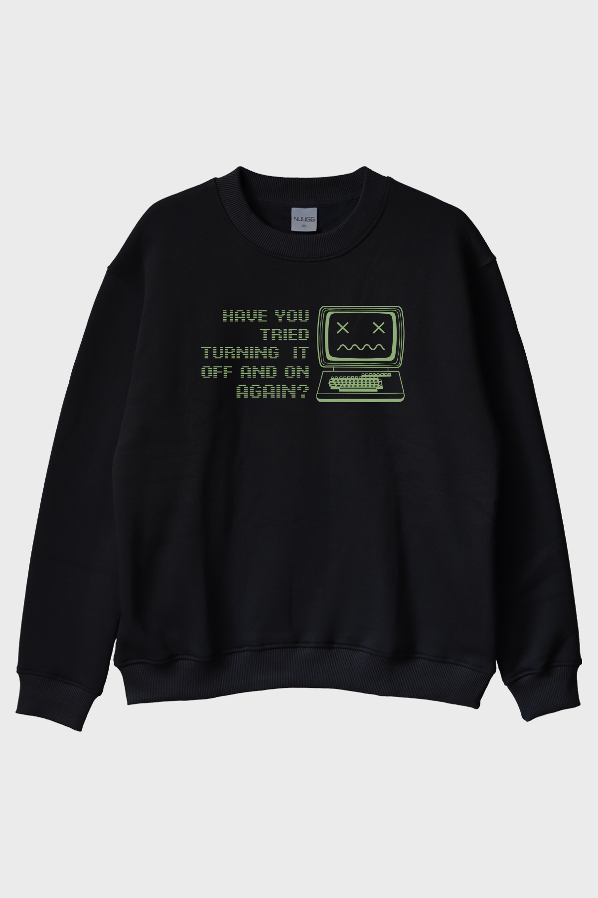 Bu eşsiz tasarımlı bisiklet yaka sweatshirt, teknoloji ve mizah dünyasını bir araya getiriyor. Ön kısmında yer alan yeşil renkteki minimalist retro bilgisayar grafiği ve hemen yanında yer alan 'HAVE YOU TRIED TURNING IT OFF AND ON AGAIN?' yazısı, günümüz teknoloji dünyasının klasik esprilerinden birini sunuyor. Piksel stilindeki bu grafik ve yazı, nostaljik bir bilgisayar ekranı efekti vererek kullanıcıya benzersiz bir deneyim yaşatıyor.