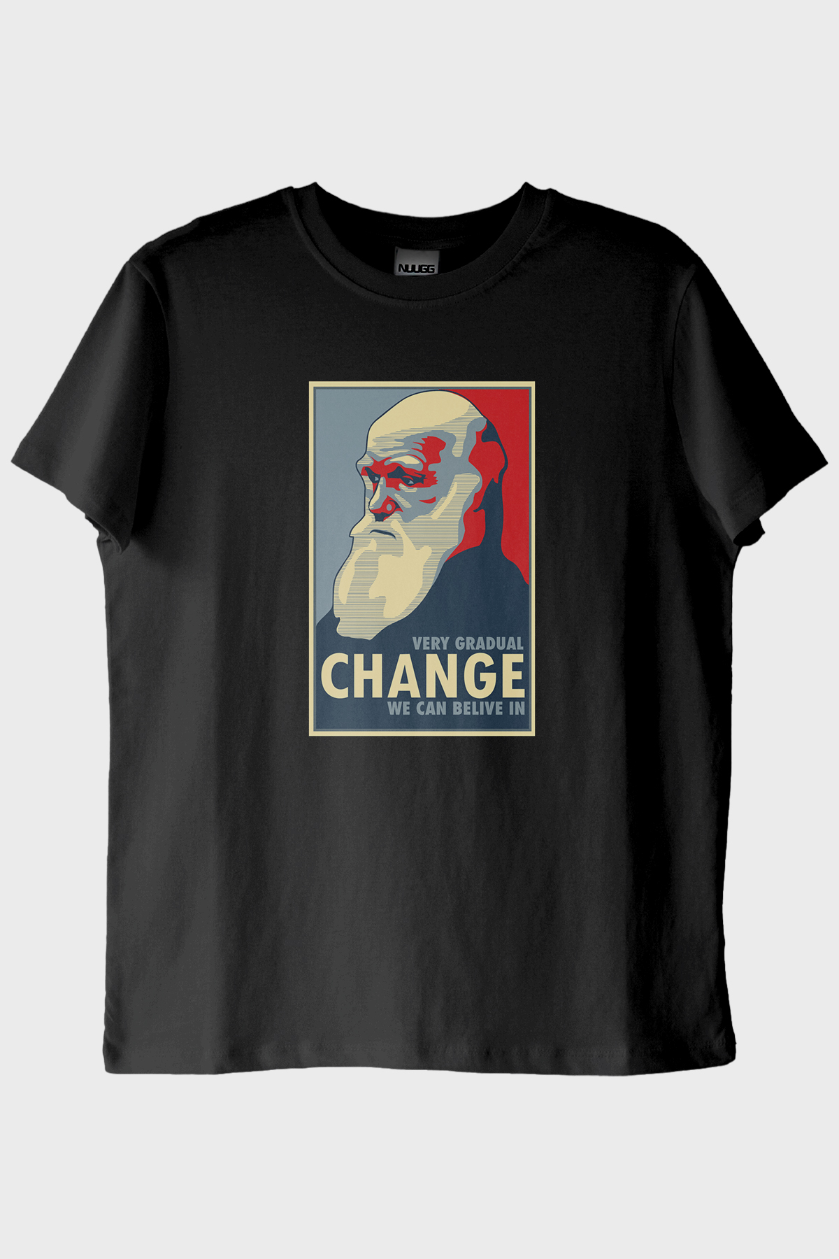 İşte karşınızda bilim ve mizahın benzersiz bir birleşimi: VERY GRADUAL CHANGE Baskılı Tişört. Bu tişört, siyah bir zemin üzerine yerleştirilmiş dikkat çekici bir baskıya sahip. Göğüs üzerinde yer alan portre, eski poster tarzında hazırlanmış; sarı, kırmızı ve mavi tonları ile nostaljik bir etki yaratıyor. Üst kısmında "VERY GRADUAL CHANGE" ve altında "WE CAN BELIEVE IN" ifadesiyle, bilimsel değişim ve evrim temalarını esprili bir dille ifade ederken, günlük kıyafetlerinize mizahi bir dokunuş ekliyor.
