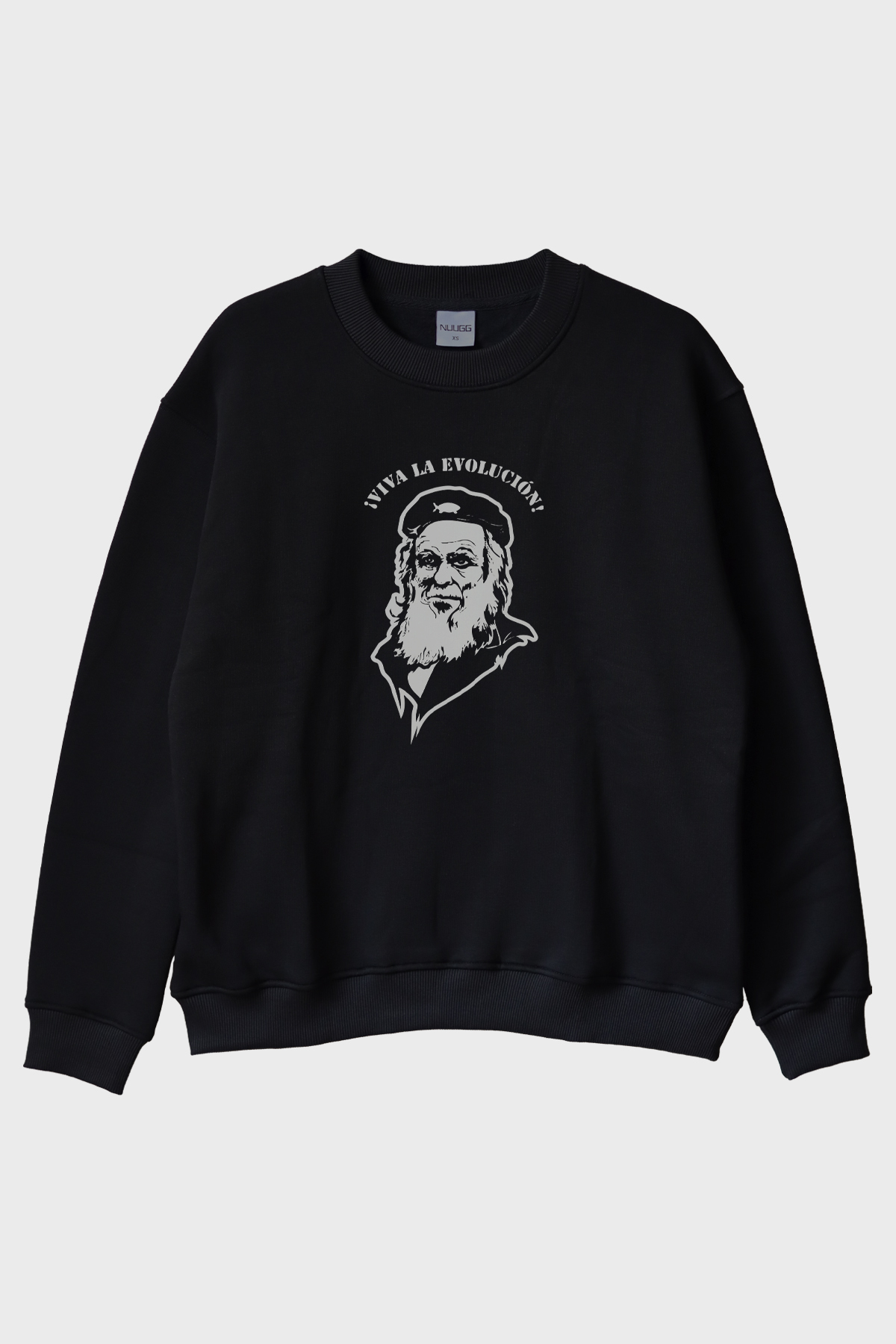 Özgün ve yaratıcı bir tasarıma sahip olan ¡Viva la Evolución! baskılı bisiklet yaka sweatshirt, bisiklet yaka sweatshirt koleksiyonumuzun en dikkat çekici parçalarından biridir. Bu eşsiz tasarım, siyah zemin üzerine beyaz renkte basılarak güçlü bir kontrast yaratıyor. Göğüs kısmında, başında ikonik şapkasıyla stilize edilmiş ünlü bir figür yer alırken, üzerindeki İspanyolca "¡Viva la Evolución!" ifadesi, bilimsel bir mizahla modern kültüre gönderme yapıyor.