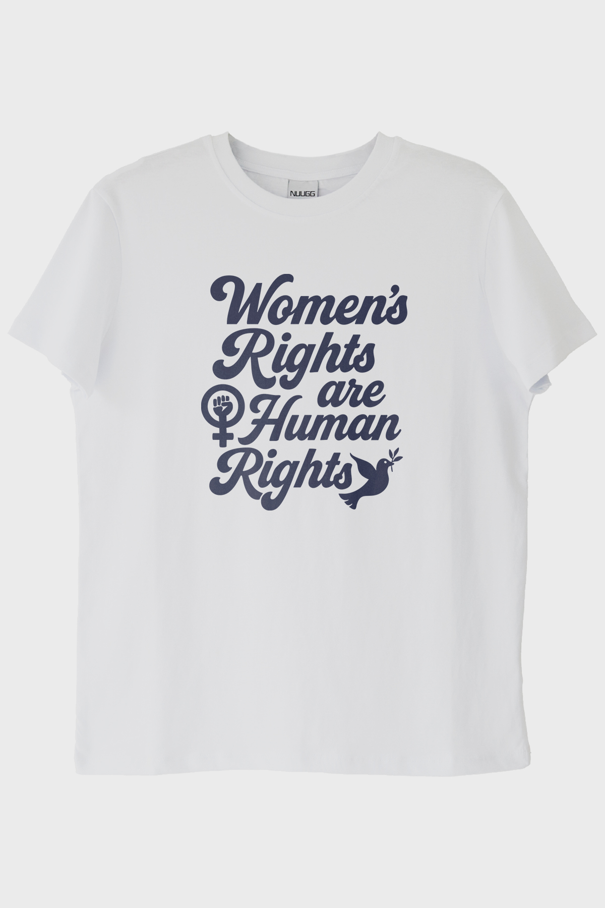 %100 pamuk ve cilt dostu bu tişört, kadın hakları temasıyla tasarlanmıştır. Ön yüzünde büyük ve kıvrımlı yazı tipinde 'Women's Rights are Human Rights' sloganı, yanlarında ise kadın sembolü içindeki yumruk ikonu ve beyaz güvercin sembolü yer almaktadır. Bu tasarım, güçlü bir mesaj ile barışı temsil ederken stil sahibi bir görünüm sunar.
