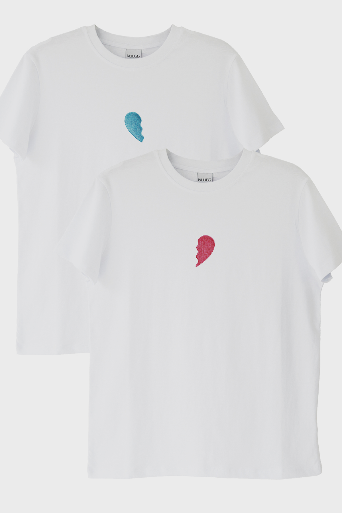 Ön kısmındaki tasarımda bir yarım kalp pembe, diğerinde ise mavi olarak işlenmiştir. Bu tişörtler, bir araya geldiğinde tam bir kalp şekli oluşturur ve aşkınızı simgeler. %100 pamuk kumaşından üretilen bu tişörtler, rahat ve kaliteli bir giyim deneyimi sunar.