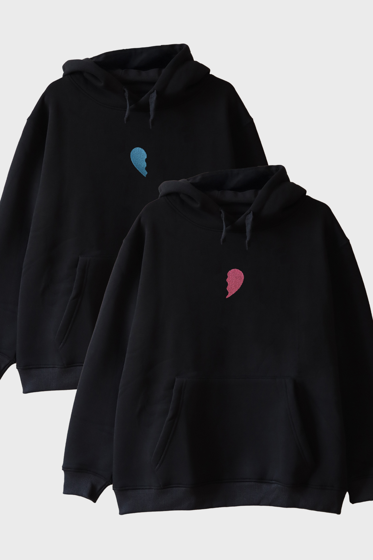 Ön kısmındaki tasarımda bir yarım kalp pembe, diğerinde ise mavi olarak işlenmiştir. Bu tişörtler, bir araya geldiğinde tam bir kalp şekli oluşturur ve aşkınızı simgeler. %66 pamuk kumaşından üretilen bu tişörtler, rahat ve kaliteli bir giyim deneyimi sunar.