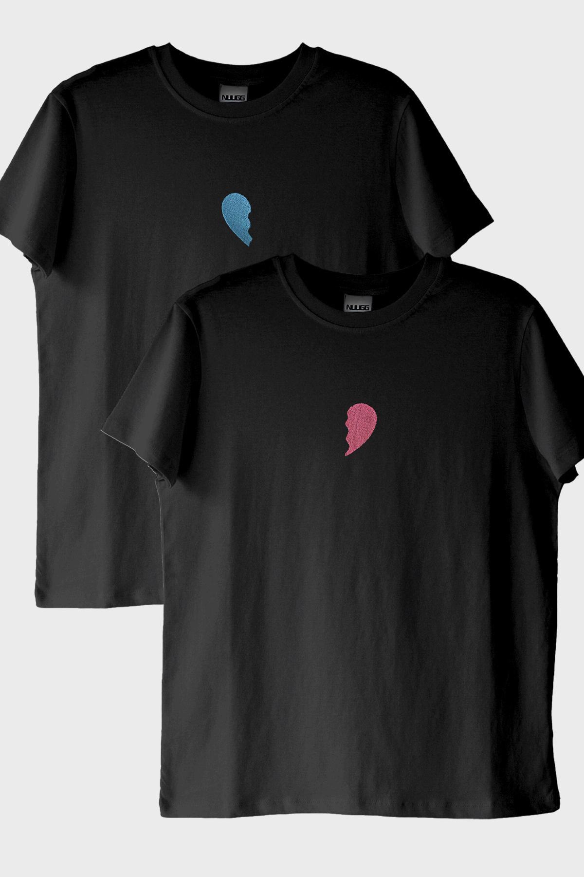 Ön kısmındaki tasarımda bir yarım kalp pembe, diğerinde ise mavi olarak işlenmiştir. Bu tişörtler, bir araya geldiğinde tam bir kalp şekli oluşturur ve aşkınızı simgeler. %100 pamuk kumaşından üretilen bu tişörtler, rahat ve kaliteli bir giyim deneyimi sunar.