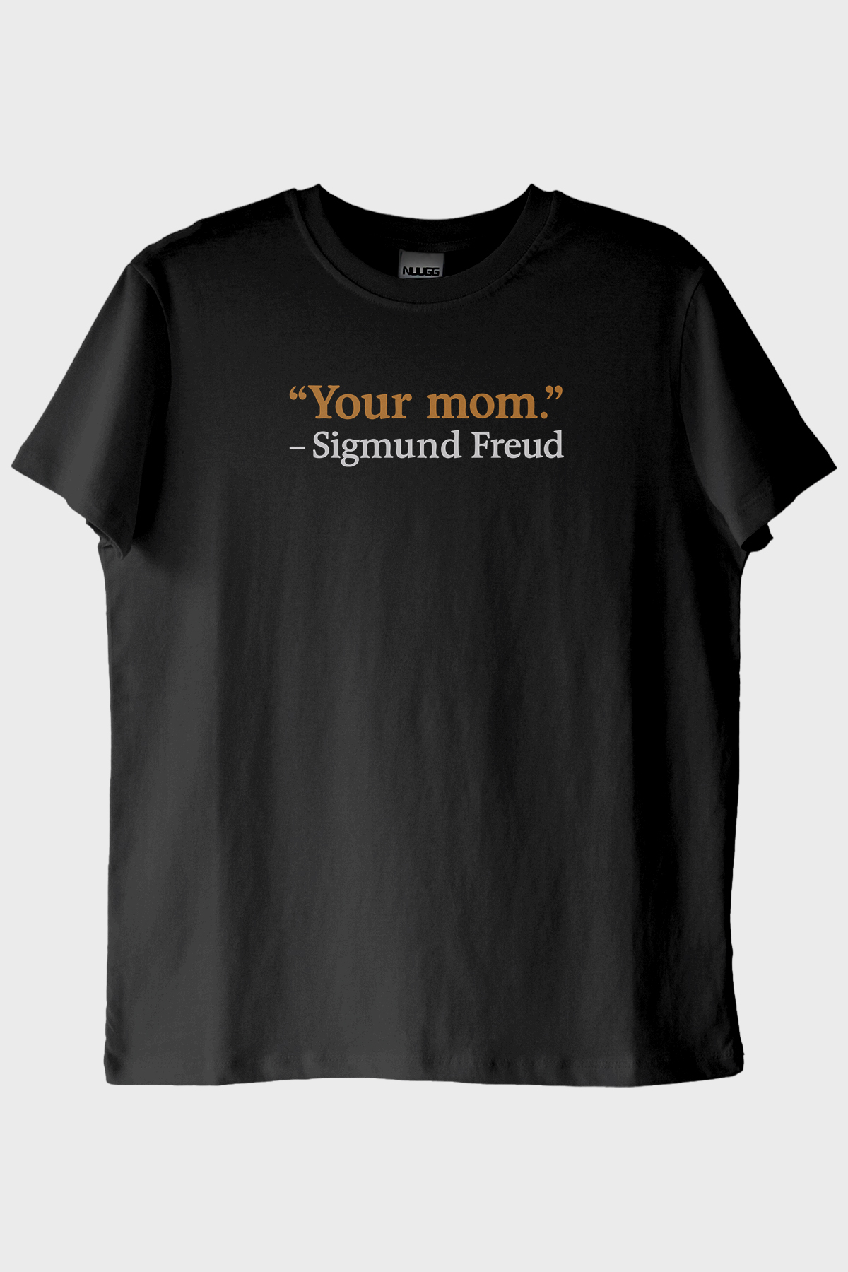 Yeni ve dikkat çekici T-Shirt tasarımı ile tanışın: Your Mom Mizahi Baskılı Tişört! Bu tişört, beyaz zemin üzerine konumlandırılmış, esprili ve ironik bir tasarım sunuyor. Göğüs kısmına yerleştirilmiş 'Your mom.' yazısı, kahverengi tonları ile baskılandı ve hemen altında, mavi ile yazılmış '– Sigmund Freud' ifadesi yer almakta. Bu özelliği, Freud'un ünlü esprisine atıfta bulunarak kullanıcılarına hem eğlenceli bir giyim parçası hem de düşündürücü bir mesaj sunmayı hedefliyor.