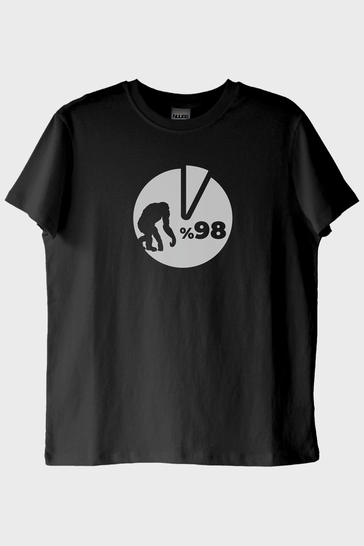 Tişörtün göğüs kısmında büyük yuvarlak bir daire içinde, yüzde 98 grafik tasviri ve primat silüeti bulunmaktadır. Bu dikkat çekici tasarım, insanların ve maymunların genetik benzerliğine esprili bir gönderme yapar. Dairenin küçük bir dilimi farklı renkte olup yüzde 2'lik farkı vurgular. Kullanılan siyah ve gri tonlar, tasarıma minimal ve zarif bir görünüm kazandırır.