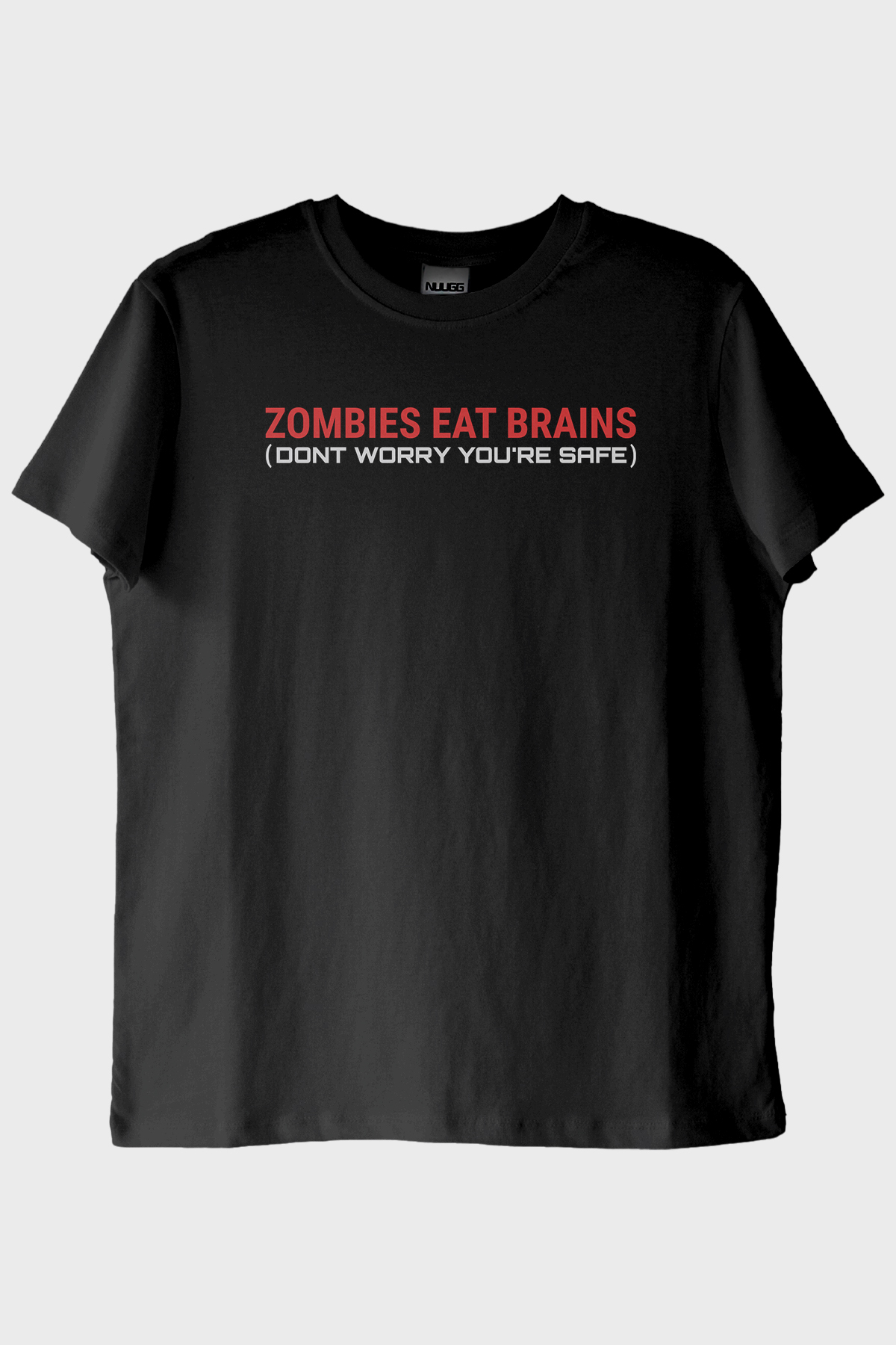 Bu eşsiz Zombies Eat Brains Baskılı Tişört ile tarzınıza bir doz mizah katın. %100 pamuktan üretilmiş olan bu tişört, yerli üretim kalitesi ve cilt dostu yapısıyla rahat bir giyim deneyimi sunuyor. Tişörtün ön kısmında büyük, kırmızı harflerle "ZOMBIES EAT BRAINS" yazısı dikkat çekiyor. Bu esprili ve ironik tasarımın alt kısmında ise, daha küçük siyah harflerle "DONT WORRY YOU'RE SAFE" mesajı bulunuyor. Sade ve okunabilir fontuyla hem dikkat çekici hem de minimalistik bir tasarım sunan bu ürün, özellikle zombi temalı giysilerden hoşlananların favorisi olabilir.